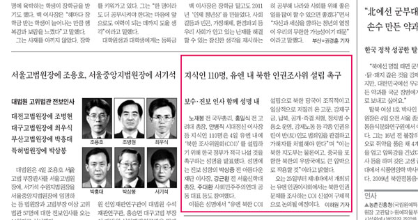 On the 4th, 110 South Korean intellectuals and human rights activists presented a statement to the public that urges the South Korean government to support the establishment of UN COI into North Korea's crimes against humanity.